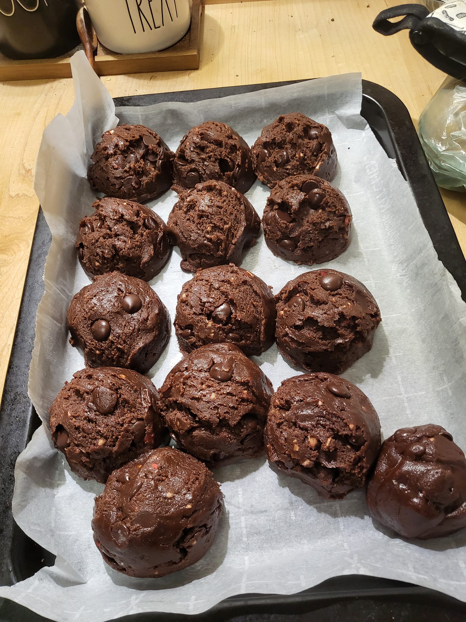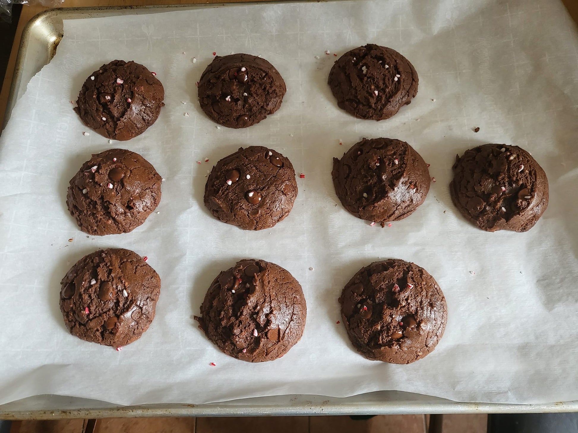 Ingredients: Flour, butter, dark brown sugar, golden sugar, cocoa powder, eggs, vanilla extract, espresso powder, baking powder, salt, peppermint candy bits, chocolate chips.