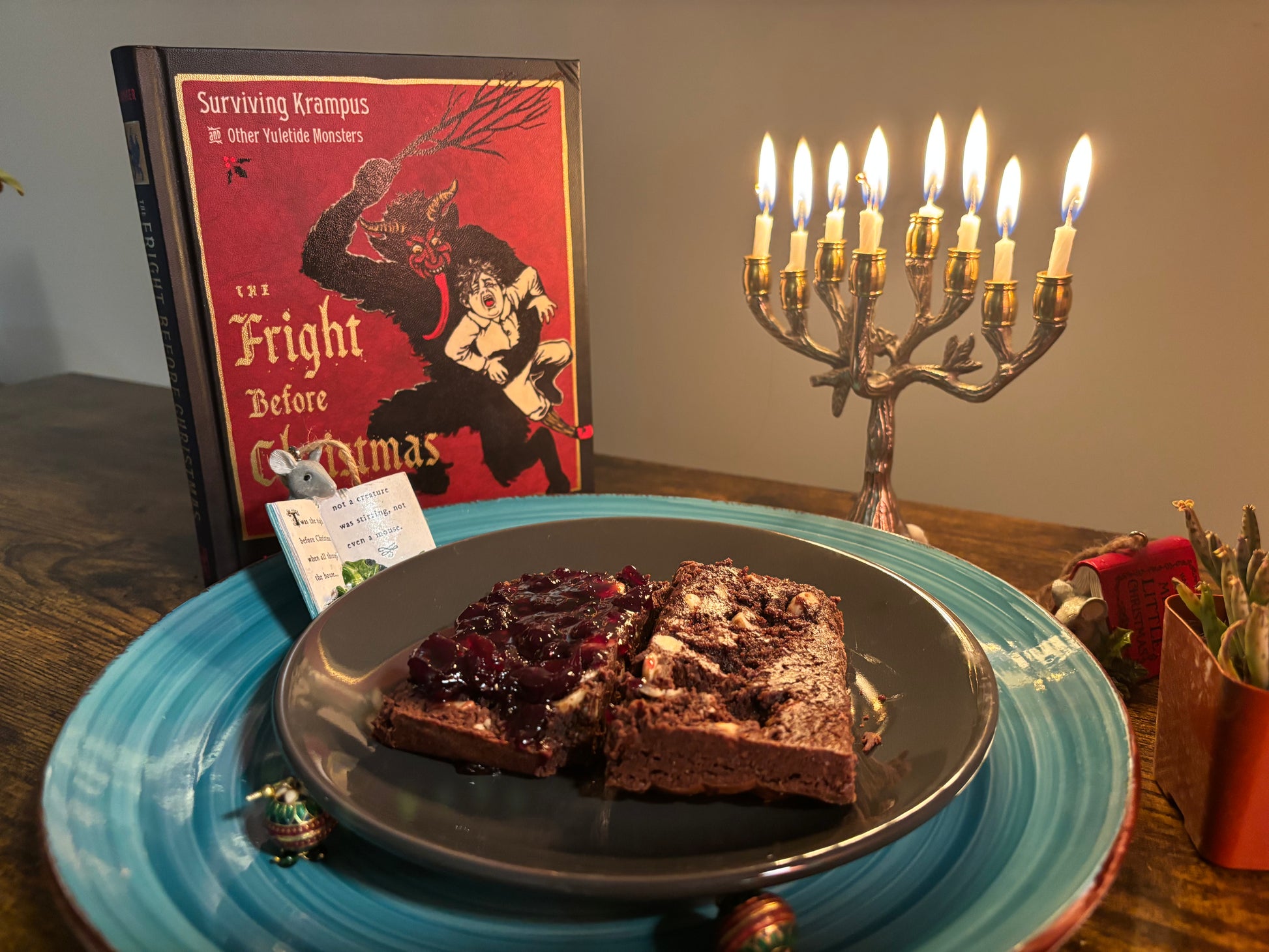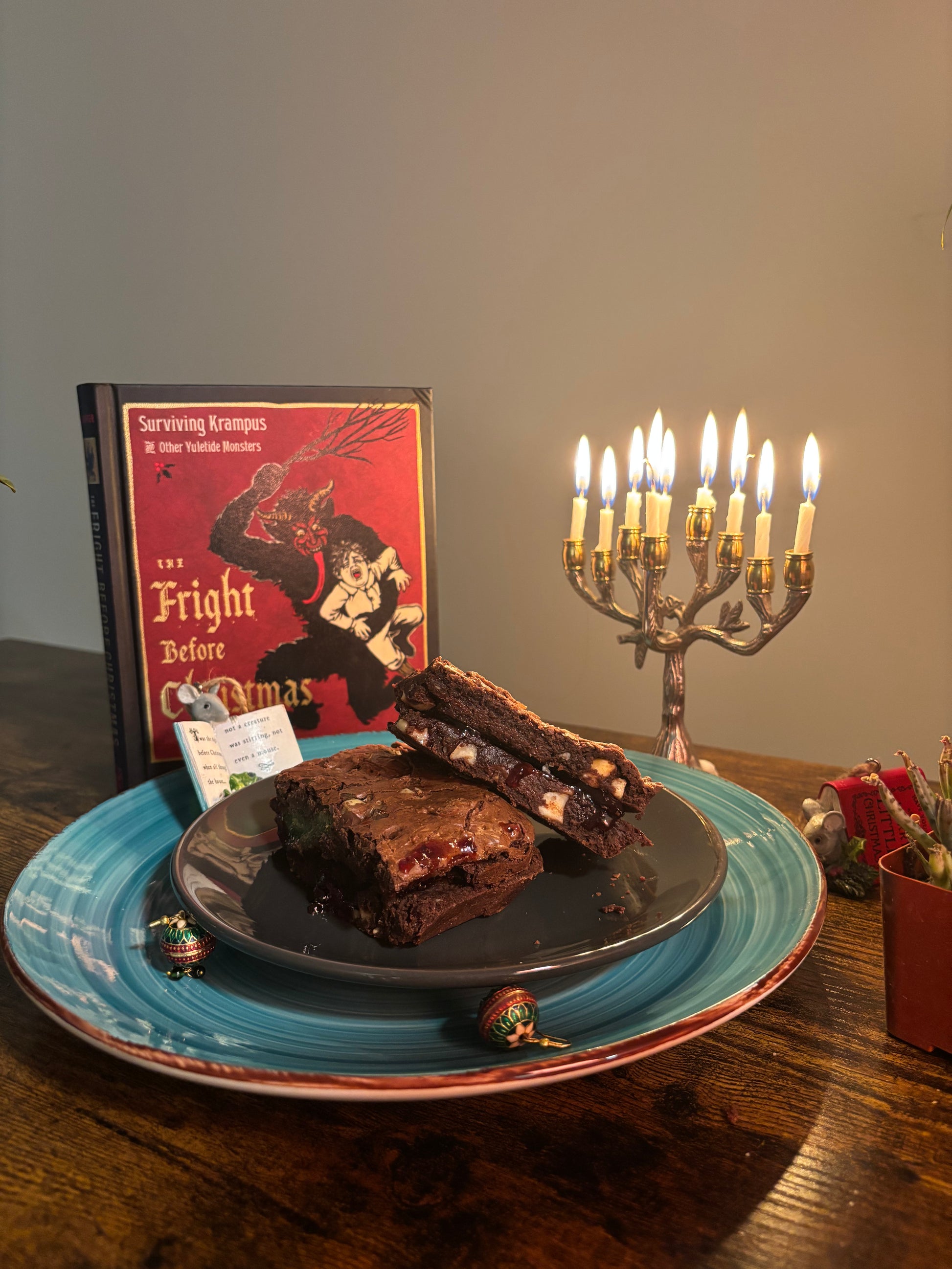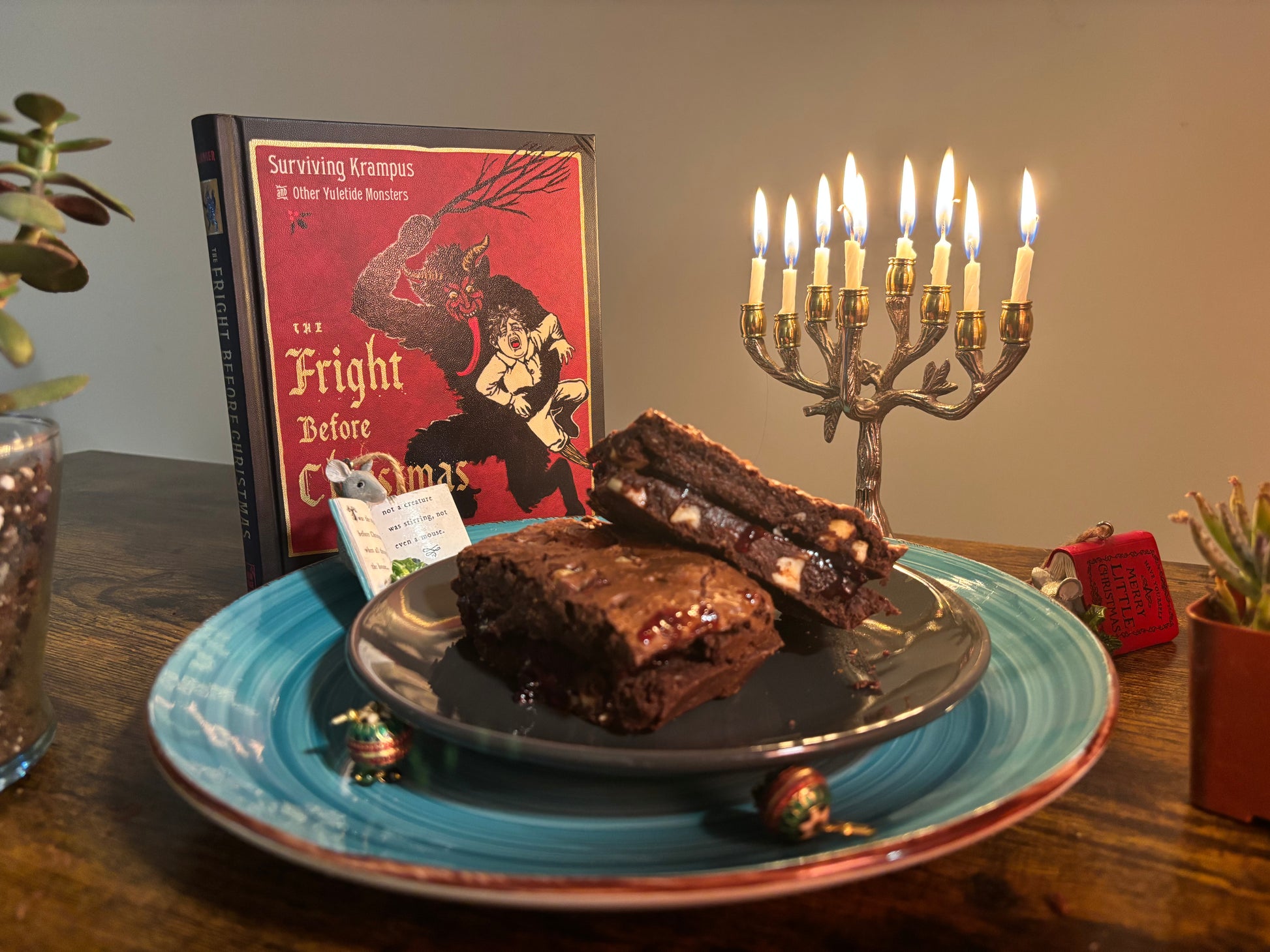 Santa? Overrated! Lure the Krampus to your home with this irresistible treat gleaned from the darkest depths of the Black Forest! A pitch black brownie filled with cherry preserves and laden with crunchy hazelnuts, the Krampus will just HAVE to stop at your house, and hand out beatings to any naughty children that he finds therein! Muahaha!