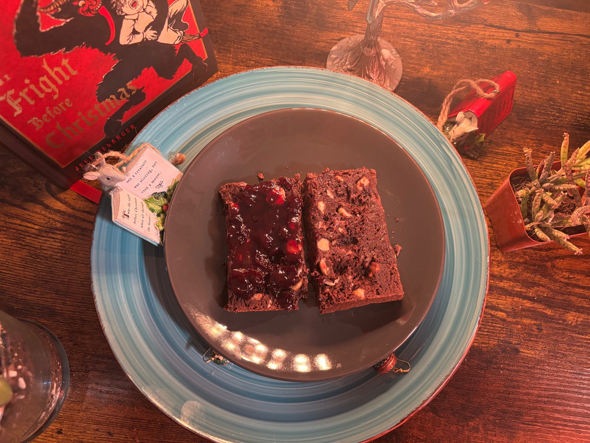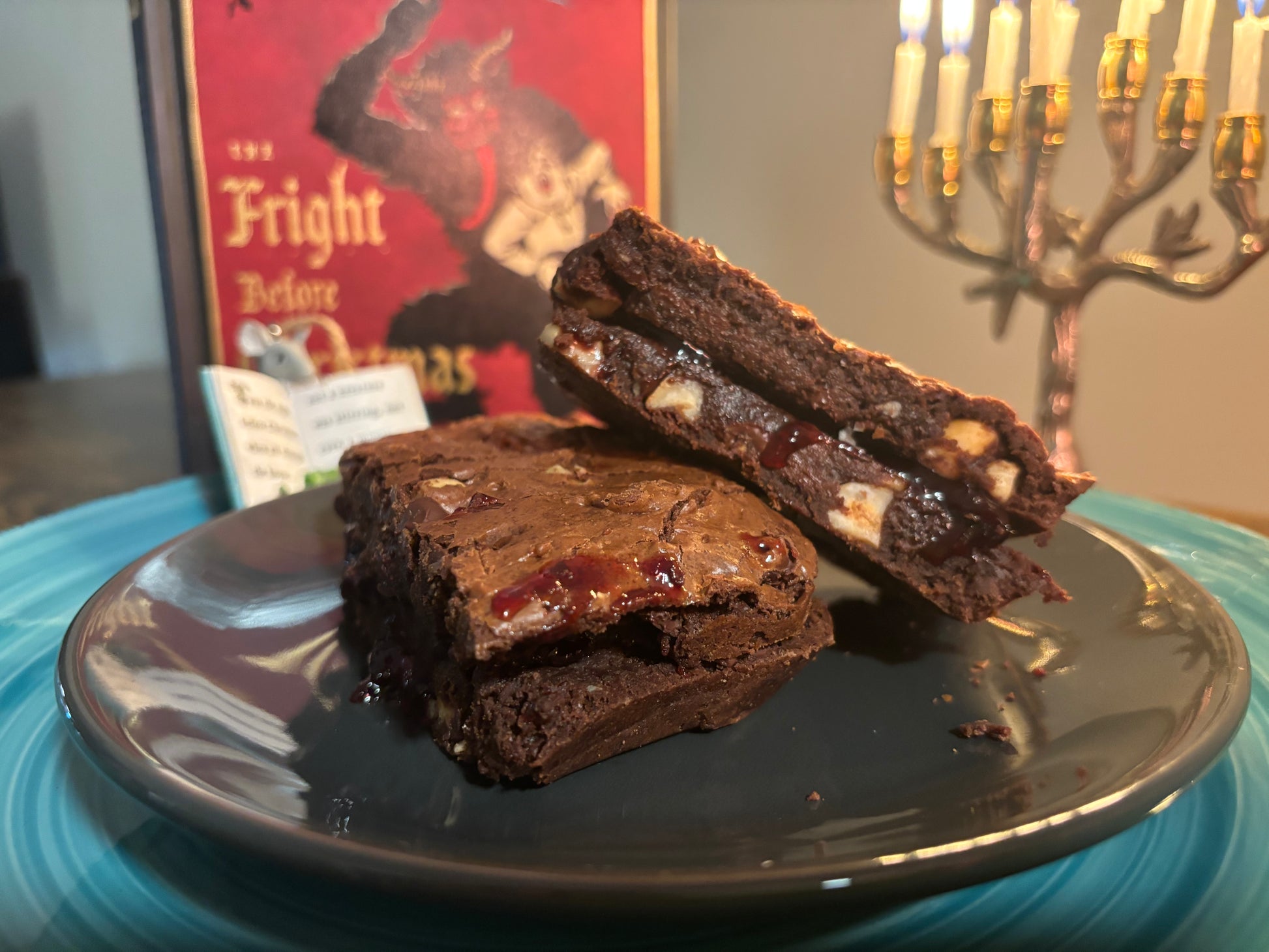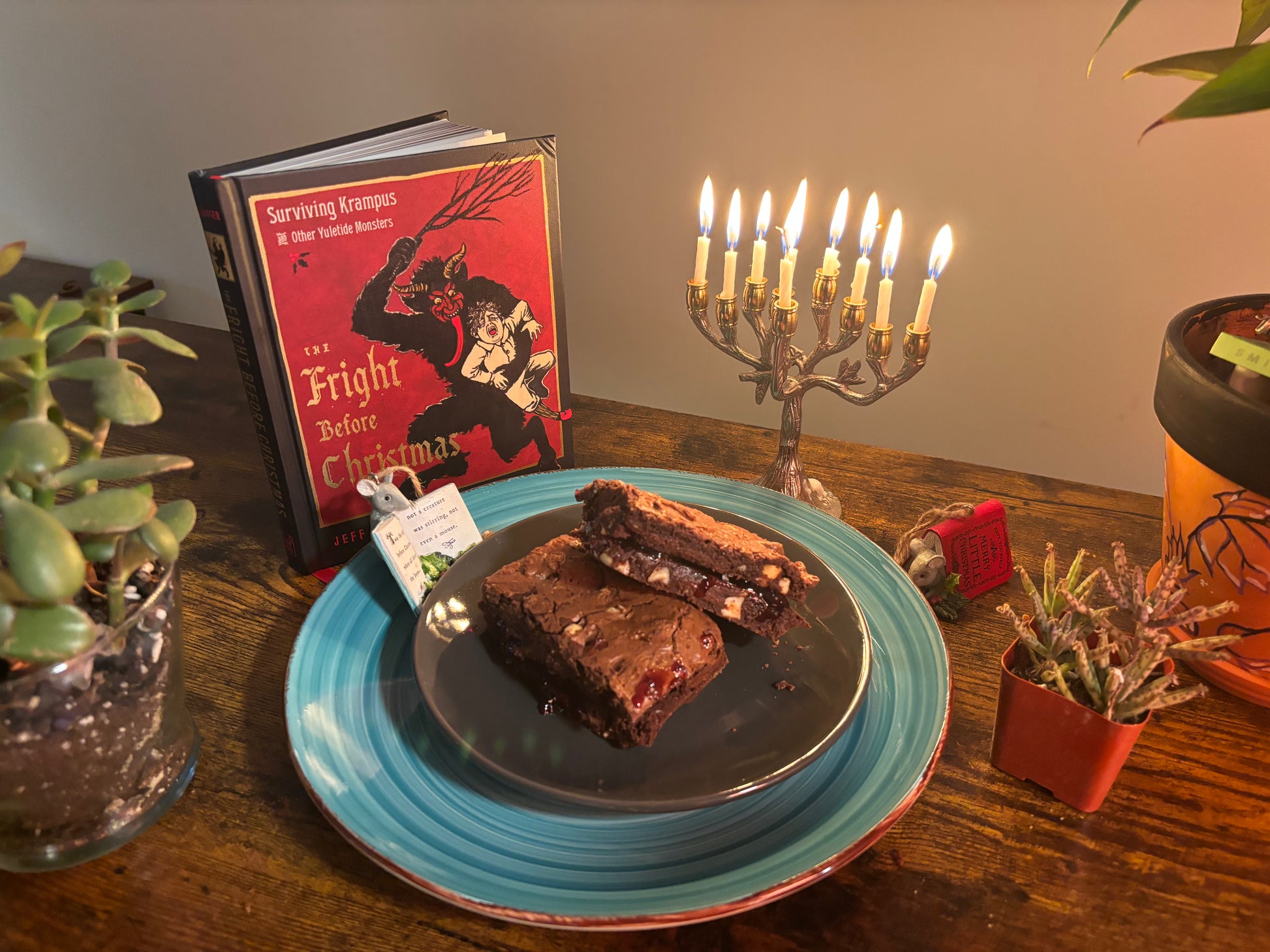 Santa? Overrated! Lure the Krampus to your home with this irresistible treat gleaned from the darkest depths of the Black Forest! A pitch black brownie filled with cherry preserves and laden with crunchy hazelnuts, the Krampus will just HAVE to stop at your house, and hand out beatings to any naughty children that he finds therein! Muahaha!