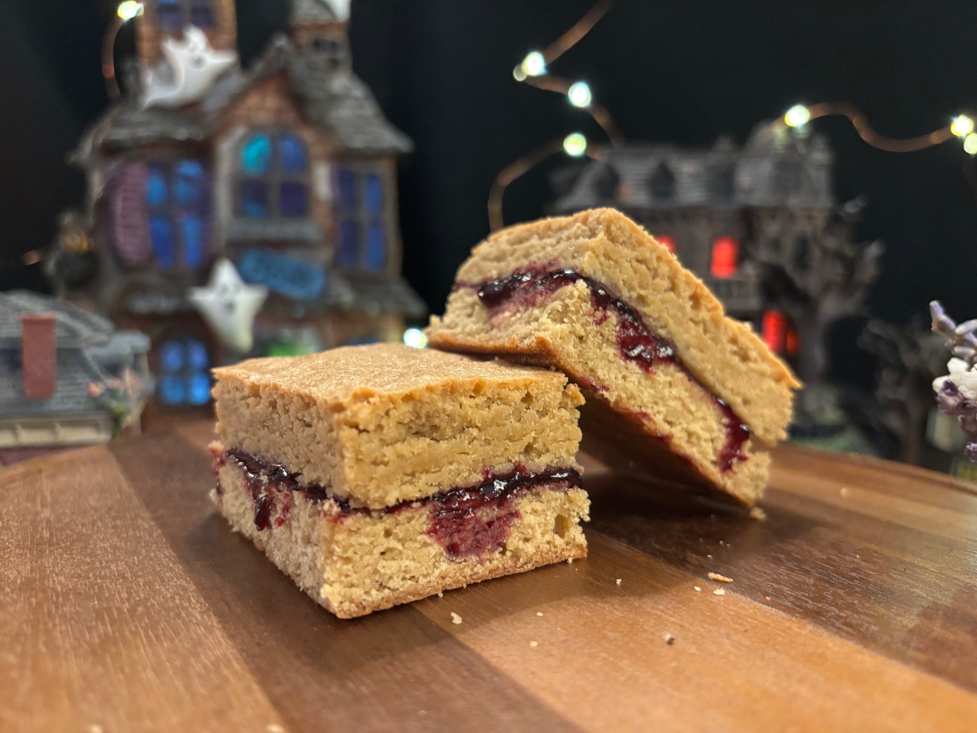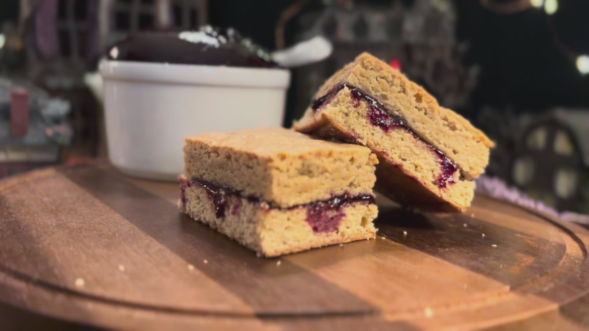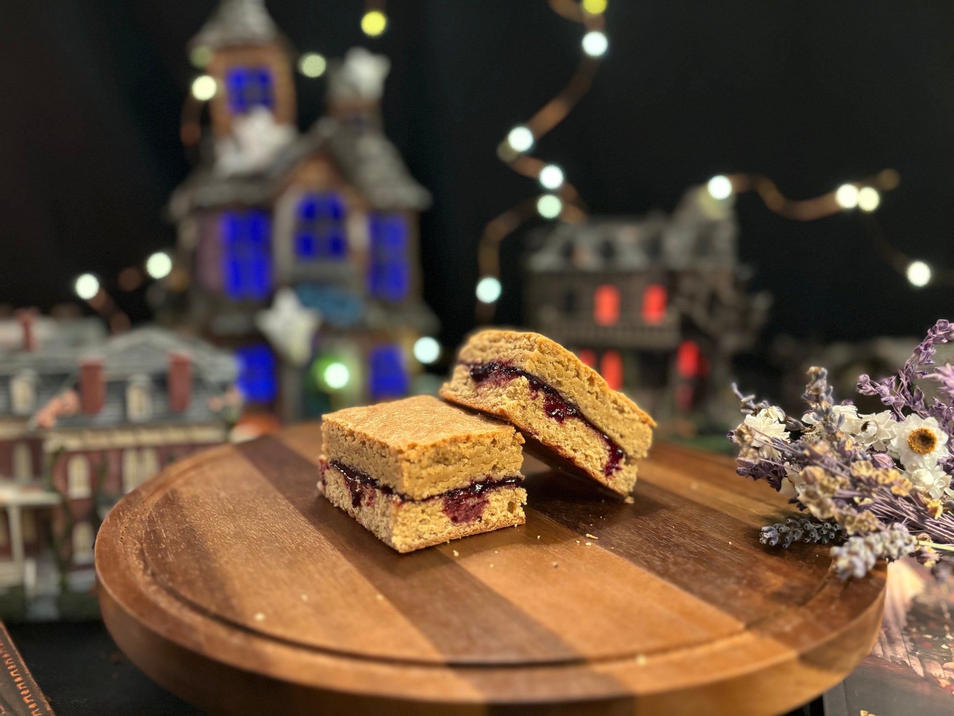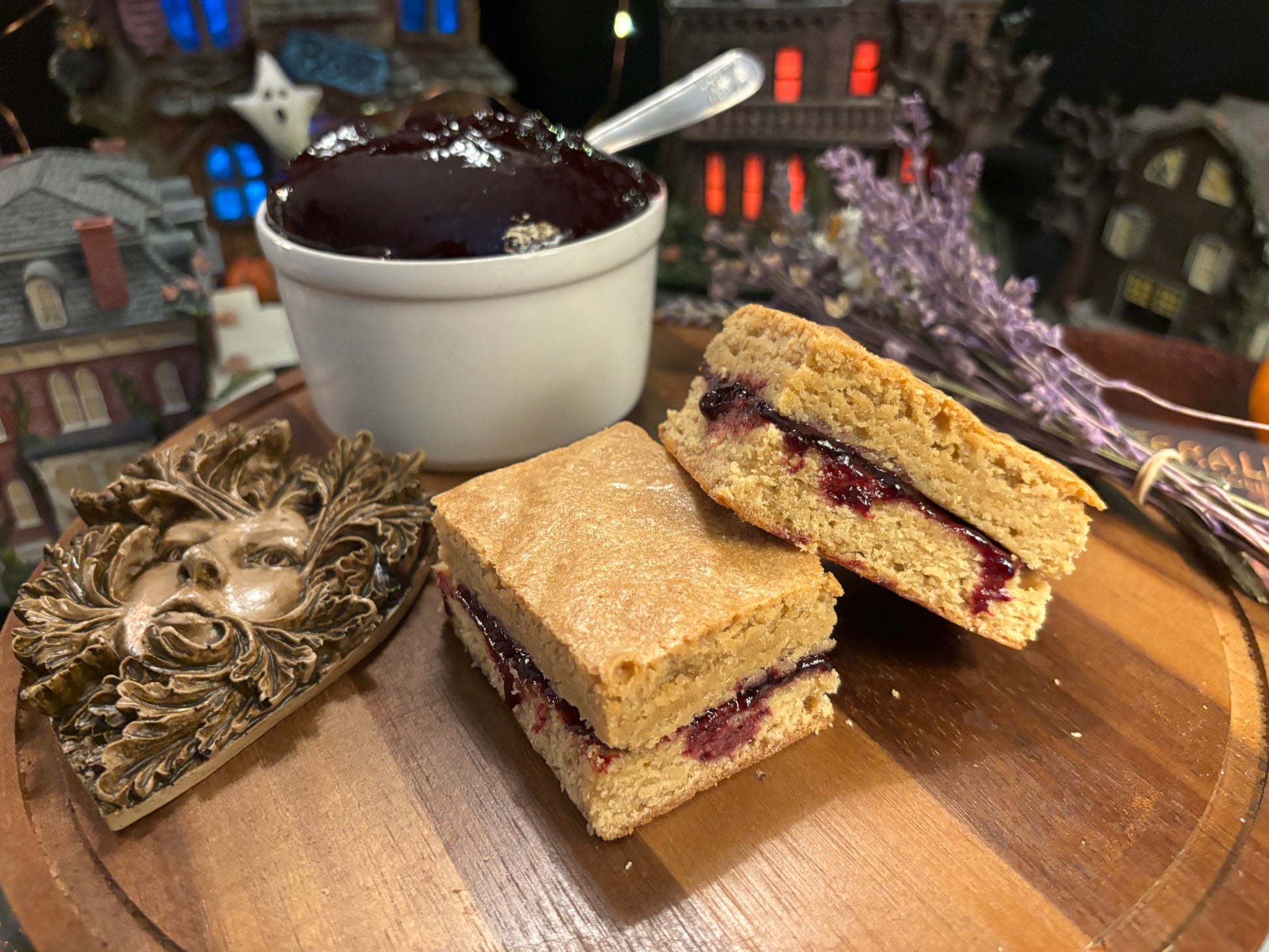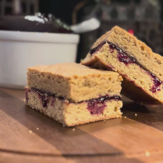 Ingredients: Flour, sugar, butter, eggs, seedless olallieberry jam, vanilla extract, salt, baking powder